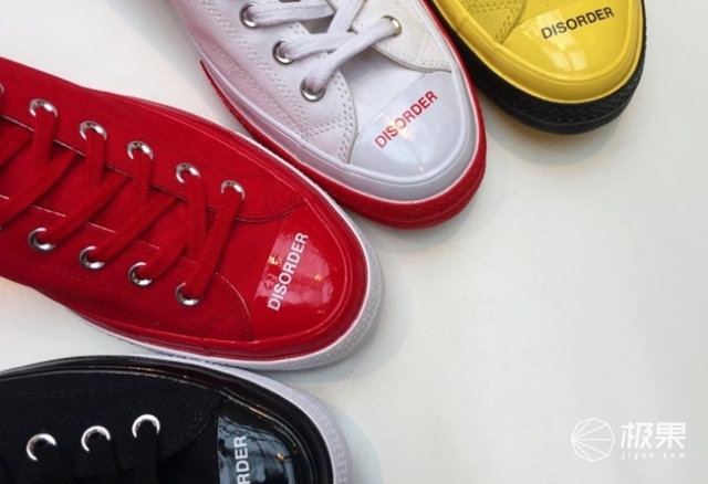 這次的最新聯名款使用瞭 Chuck Taylor 為原型,並且搭配瞭黑紅、黑黃、白紅、紅白四種配色,並且在漆皮紙做的鞋頭還印有 ORDER 和 DISORDER 標語。